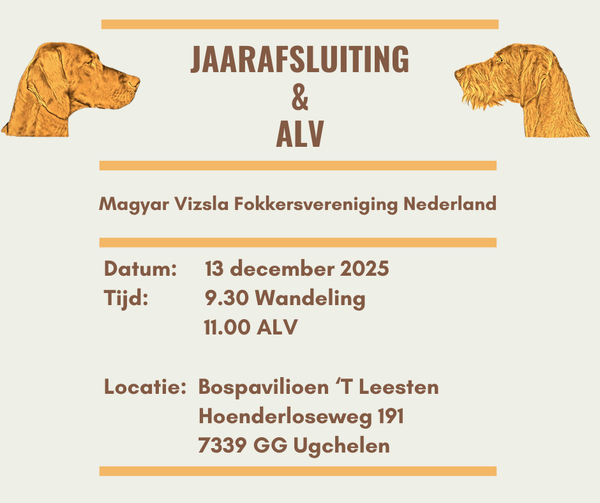Wij willen al onze leden uitnodigen voor onze gecombineerde ALV en jaarafsluiting op zaterdag 13 december. We kijken ernaar uit om samen terug te blikken op het afgelopen jaar, plannen te delen én natuurlijk om samen met onze vizsla’s te genieten van een fijne wandeling.